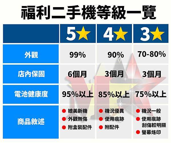 4🌟 : 外觀9成新、3個月、電池健康度85%以上、機況優異、使用痕跡、附配件